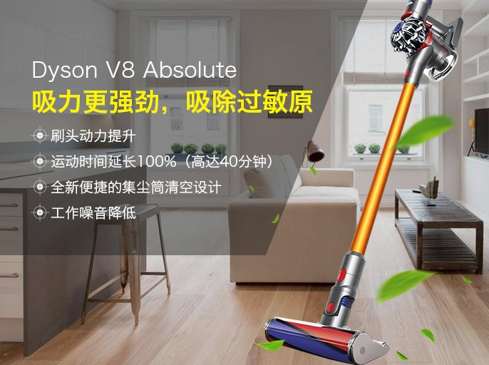 戴森V8 Absolute无线吸尘器,采用了戴森V8数码马达,V8系列采用号称“无衰减(fade-free)锂离子电池”,将续航提升到了40分钟,比V6续航能力整整提升了一倍。与V6系列相同,V8系列依然采用了双层设计的15个圆锥气旋,但将强力模式的吸力从100AW提升到了115AW(强力模式续航7分钟以上,相比V6同样小幅提升)。在吸力增强的前提下,V8系列的噪音反而控制的更好,Dyson官方表示噪音只有V6系列的一半。