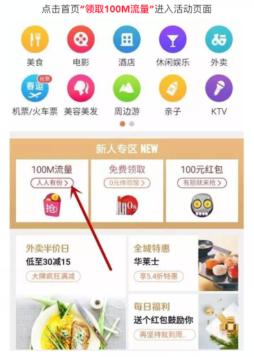 活动截止至2016年12月18日,凡下载大众点评app的用户,均可在首页免费领取100M流量!