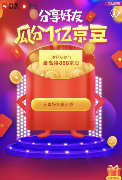活动期间,用户在发送活动页面有机会领取优惠券,好友拆礼包后发送者有机会领取最高888京豆!